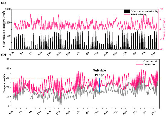 Based on the optimized model, a comprehensive 75-day thermal environment test of the novel greenhouse was conducted, recording temperature variations both inside and outside from 29 February to 15 May (Figure 11). The results indicated that during the daytime, the indoor temperature of the greenhouse consistently remained approximately 10 °C higher than the outdoor temperature. This significant temperature difference is attributable to the roof greenhouse’s effective heat-collecting properties and its enclosed design, which capture and store solar energy efficiently. At night, the indoor temperature stabilized around 15 °C (Figure 11b), thanks in large part to the strategic use of phase change materials (PCMs). These materials play a crucial role in regulating the greenhouse environment. During the day, the PCMs absorb excess heat, preventing overheating that can stress the plants. When nighttime arrives and temperatures drop, the PCMs release the stored heat, mitigating excessive cooling and ensuring a stable temperature. This process maintains an optimal environment conducive to plant growth, supporting critical physiological and metabolic processes essential for healthy development.