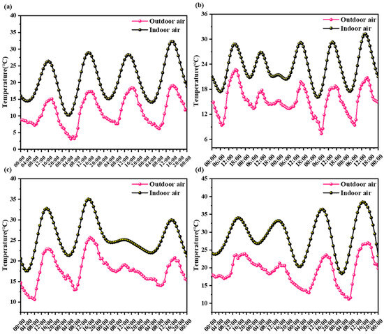 Furthermore, we optimized the phase transition temperature. In the simulation, the initial indoor air temperature decreased with the increase in the phase transition temperature (Figure 10a). This was because the higher phase transition temperature improved the absorption of heat, resulting in a decrease in the temperature and thermal radiation of the nanofluid. However, from 03:00 p.m. to 09:00 a.m. the next day, as the phase transition temperature rose, the indoor temperature began to pick up, mainly due to increased heat storage and longer heat release times. When the phase transition temperature was set to 22 °C, the indoor temperature was maintained at 15–18 °C on most nights. With the increase of phase transition temperature, the peak value of indoor temperature gradually decreased, and the occurrence time was delayed accordingly (Figure 10b). This caused the time required for the phase transition to become longer because more heat needed to be absorbed. In the exothermic stage, the higher phase transition temperature allowed more heat to be stored, resulting in an increase in indoor temperature.