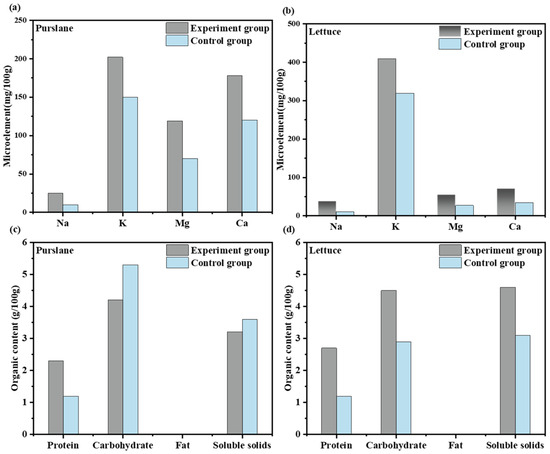 - The growth rates of purslane, asparagus, and lettuce in the experimental group increased by 55%, 35%, and 40%, respectively. The leaves were notably greener, glossier, and more vibrant compared to the control group. In terms of trace elements, the purslane from the experimental group contained 2.5, 1.35, 1.7, and 1.49 times more sodium, potassium, magnesium, and calcium, respectively. For lettuce, the trace elements were 3.8, 1.28, 2.01, and 2.06 times higher. Additionally, for the lettuce from the experimental group, protein, carbohydrates, and soluble solids were 2.25, 1.56, and 1.48 times higher than the control group.