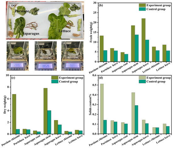 In the 75 days, this experiment mainly monitored the growth of vegetables in the greenhouse and the content of nutrients after maturity. After about 75 days of growth, three vegetables were harvested by cutting branches on the surface of the soil and carefully separating the roots from the sandy substrate [39]. The branches and roots were washed with distilled water, dried with tissue paper, and weighed. The shoots and roots were then separated, and the height and leaf count of each plant were recorded. Afterward, the samples were dried at 75 °C for 48 h to assess dry weight and micronutrient concentration. Moisture content (MC) was determined through direct drying in a drying oven and expressed as a percentage. The sample was measured three times, and the average value was taken [40]. The plants were divided into roots, stems, and leaves, and their fresh weights were recorded individually. The dry matter content for the roots, stems, and leaves was calculated as follows: