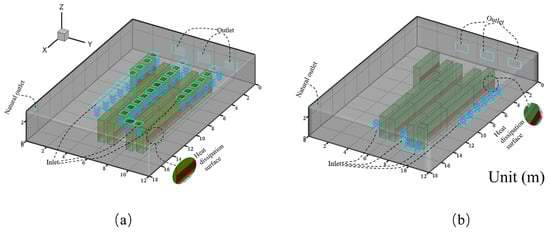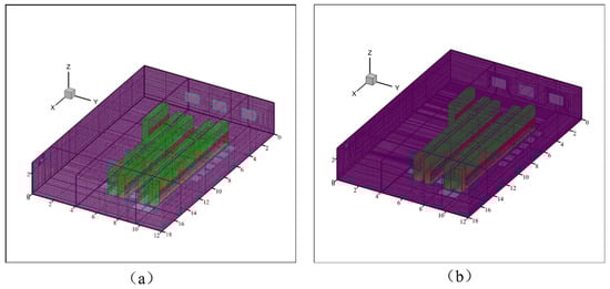 Three-dimensional physical models of the control room for (a) Case 1 and (b) Case 2 (the green color represents the equipment with the heat dissipation and the grey color represents the ventilation space).