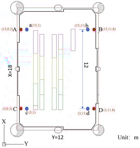 Field measurements were conducted on 8, 10, and 12 July 2024. The temperature sensors (KE-COS-03, SiN Electronic Technology Co., Ltd., Jinan China) were used, with a temperature monitoring range of −5 to 45 °C and a basic error of ±1 °C. The device displays readings with three digits and a resolution of 0.1 °C, and it was also used for long-term temperature monitoring. The temperature-measuring instrument recorded a temperature reading at one-minute intervals. The measurement of the inner wall and airflow temperatures lasted for 3 days, with 24 h data collection at each measurement point per day. Figure 3 presents the layout of the measurement points. The measurement points were positioned at the height of Z = 1.75 m. The measuring points A (X = 15, Y = 0.2), B (X = 15, Y = 11.8), C (X = 3, Y = 0.2), and D (X = 3, Y = 11.8) were arranged to measure the inner wall temperatures, while the measuring points a (X = 15, Y = 1), b (X = 15, Y = 11), c (X = 3, Y = 1), and d (X = 3, Y = 11) were employed to measure the airflow temperatures in the control rooms. The average temperature and relative error for each point were calculated over the three-day period.