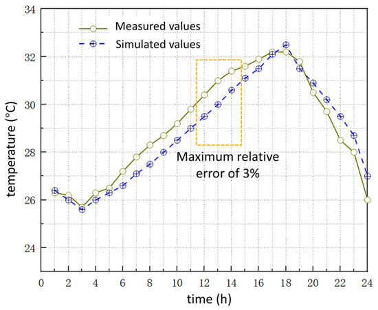 In summer, the radiant heat from the external environment has an insignificant impact on the control room of the electric submersible pump compared to the heat generated by the equipment. Therefore, this radiant heat flux can be considered negligible. To simplify the model and reduce the computational complexity, the temperature boundary condition for the inner wall was determined by averaging the inner wall temperature measurements taken in the control room between 12:00 noon and 2:00 pm during the measurement period.
