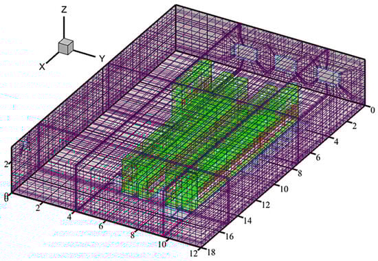 A high-quality computational grid is the key to convergent and accurate results. If the grid is coarse, it may lead to low solution accuracy; on the other hand, if the mesh is too fine, it may significantly increase the computational cost []. The Airpak 3.0 provides three different mesh generation tools: hexahedral, tetrahedral, and hexagonal mesh generators. Among these, the unstructured hexahedral mesh generator is the default and is recommended for use in various scenarios due to its broad applicability [,]. Therefore, this generator was used. Airpak 3.0’s preset parameters were used to generate an initial mesh representing the minimum number of elements that represented the model geometry and met the default mesh criteria, as shown in Figure 5. A total of 108,030 elements were generated for Case 1.
