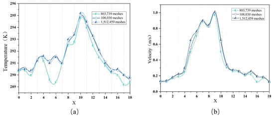 Airflow temperature (a) and velocity distributions (b) along a line parallel to the positive X-axis, starting at X = 0, Y = 11 m, and Z = 1.3 m, for three different mesh resolutions.