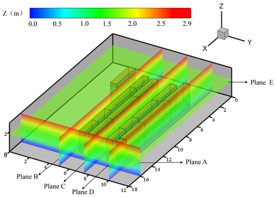 To fully evaluate the effectiveness of these two ventilation solutions in achieving effective ventilation and cooling and ensuring occupant comfort, the simulation results are presented by focusing on five key planes, as shown in Figure 8. These planes, which cover the main pedestrian areas and the space representing the perceived head height of standing occupants, include the following: the X = 16 m plane (Plane A), perpendicular to the X-axis; the Y = 5 m plane (Plane B), perpendicular to the Y-axis; the Y = 7.5 m plane (Plane C), perpendicular to the Y-axis; the plane of Y = 10 m (Plane D), also perpendicular to the Y-axis; and finally the plane of Z = 1.75 m, perpendicular to the Z-axis (Plane E). These were selected taking into account the perceived average height of the worker’s head when standing.