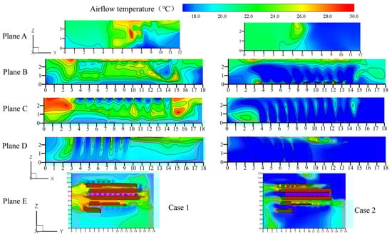 Airflow temperature distributions in the five planes of Case 1 and Case 2.