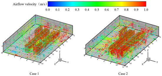 Figure 10 compares the effects of the two cases. Case 1 revealed that the airflow trajectories converged near the ceiling and then descended vertically. In contrast, Case 2 depicted the air flow as being more widely dispersed, primarily near the ground level. This solution is particularly suitable for environments where heat is mainly generated in the middle and lower parts of the plant. To further clarify the distribution of the velocity field, small dots were used to indicate the streamlines, making the distinct velocity characteristics more clearly visible and easier to interpret.