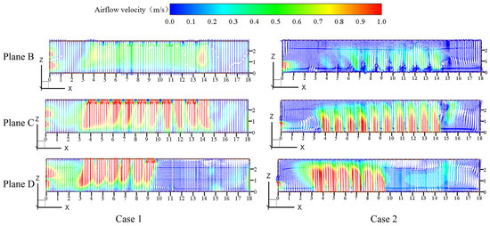 The airflow velocity distributions in Plane B, Plane C, and Plane D of Case 1 and Case 2.
