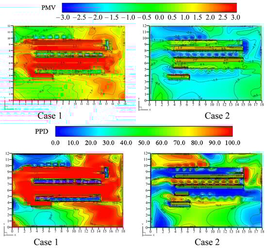 Thermal comfort distributions of PMV and PPD in Plane E of Case 1 and Case 2.