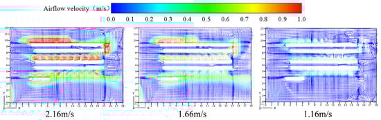 Figure 13 illustrates the airflow velocity vector distribution in Plane E under three different air supply velocities. The results indicate that at an inlet velocity of 1.16 m/s, the airflow velocity in Plane E remained steady at 0.3 m/s, meeting the requirements for the indoor airflow velocity specified in the Design Code for Heating, Ventilation, and Air Conditioning of Civil Buildings (GB 50736-2012) []. However, at higher inlet velocities (2.16 m/s and 1.66 m/s), localized red zones appeared at the same height, indicating areas where the airflow velocity exceeded the standard limits. This excessive velocity could negatively impact thermal comfort.