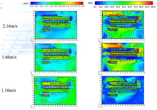 Figure 14 illustrates the PMV-PPD distribution in Plane E under three different air supply velocities. As shown in the figure, a decrease in the intake velocity led to the gradual expansion of the green area in the PMV distribution, with PMV values approaching ±0.5. This indicates an improvement in thermal comfort in the head region of the plane. When the PMV value was within the range of ±0.5, the corresponding PPD distribution showed a larger proportion of blue areas, suggesting a reduction in occupants’ dissatisfaction with the environment.