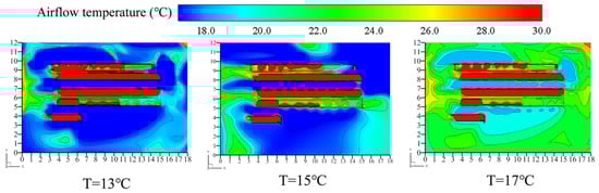Comparisons of the airflow temperature distributions in Plane E under the three air supply temperatures.