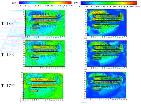 To examine the impact of intake temperature variations on the PMV-PPD, this study compared operating conditions with air supply temperatures of T = 17 °C and T = 13 °C, using T = 15 °C as the baseline. The analysis focused on the airflow temperature contour lines and the PMV-PPD distribution in Plane E. Figure 15 illustrates the temperature profile distribution in the Plane E cross-section under the three intake temperature conditions. At the baseline setting (T = 15 °C), the air temperature in Plane E was from 18 °C to 22 °C. When the air supply temperature was reduced to 13 °C, the pedestrian area temperature decreased to 18–22 °C. However, in both cases, the indoor air temperature remained below the universally recognized comfort range. Conversely, increasing the air supply temperature to 17 °C resulted in a temperature distribution heat map displaying yellow-green tones, indicating that the pedestrian area temperature rose to 26 ± 2 °C, which aligns with general comfort requirements for building ventilation and indoor temperature control standards.