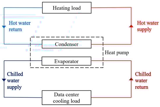 Secondly, waste heat is a kind of thermal energy source for data center, which could be re-used by a waste heat recovery system [,]. In general, such waste heat can be utilized in district heating networks or directly provided for heating other building []. The air-side cooling system can reliably supply low-temperature, high-capacity waste heat []. If the temperature is not enough, a heat pump could help elevate the grade. Waste heat can be recovered by the air-source heat pump system and applied to heating nearby office buildings. It could significantly reduce operational costs, carbon emissions, and electricity consumption, with a payback period of about 2.5 years []. Furthermore, Lin et al. [] utilized the CO2 heat pump in a data center to recover the waste heat. This system upgraded the low-temperature waste heat to meet various heat demands. Depending on the working fluids used in the cooling cycle, the system’s payback period varies between 2.04 and 2.46 years.