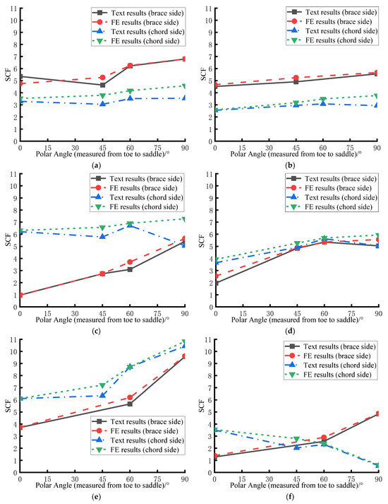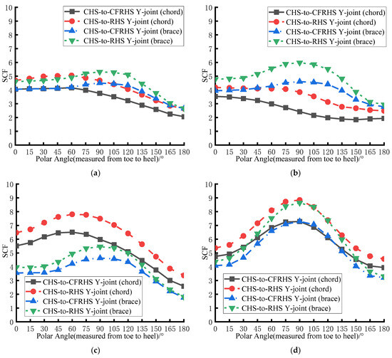 - The intersection angle of brace and chord has an important influence on the magnitudes of the SCF values on both the chord and the brace side of CHS-to-CFRHS Y-joints under axial tension loading of the brace. The values of the SCFs at the 60° location and saddle increase as the value of θ increases, reaching the maximum values when the value of θ reaches 90°, on both the chord and the brace side.