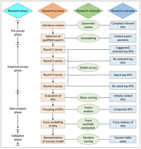 Presently, there is limited historical and empirical information on using KPIs to assess and monitor the success of HPs over the lifecycle. It is necessary to adopt an approach that explores factual data from the rich expertise and experiences of qualified respondents. Hence, the Delphi method is the most appropriate choice above other methods such as staticised groups, the nominal group technique (NGT), and focus groups [56,57]. This method solves complicated problems using experts’ opinions, self-validates outcomes through consecutive rounds, eliminates the bias effect and pressure to conform, enhances confidentiality through avoidance of direct communication among experts, preserves heterogeneity of experts for valid outcomes, and allows objective analysis using different statistical techniques [56,57,58]. In terms of limitations, the Delphi method may not be appropriate for empirical problem solving with a small budget and limited resources, a short time requirement, large sample sizes of respondents, less experienced and qualified respondents, and high attrition of respondents over time. Nevertheless, the Delphi method has gained popularity in complicated construction engineering and management (CEM) research, including sustainable development [59], team integration [60], procurement selection [61], performance evaluation [62,63], and risk assessment and allocation [57]. The process followed in this research study is presented in Figure 1.