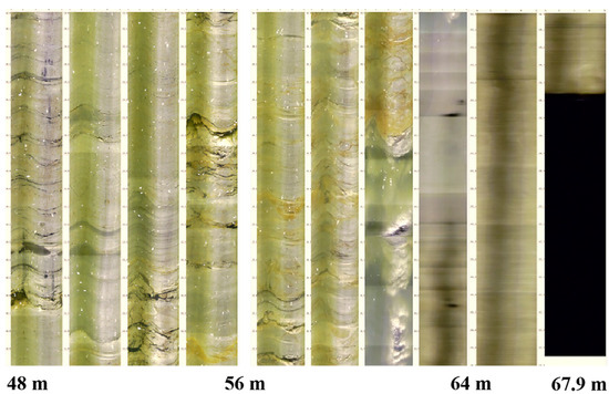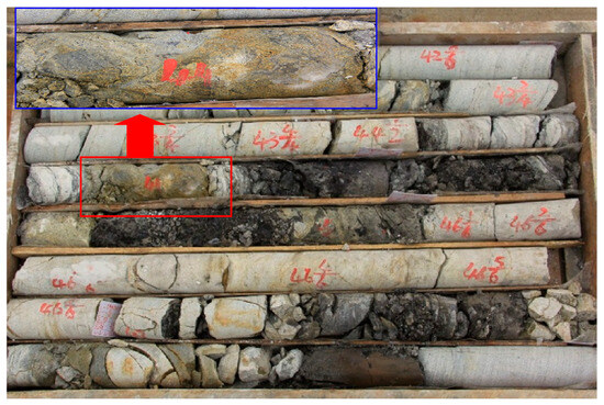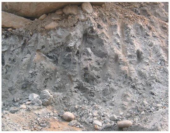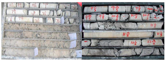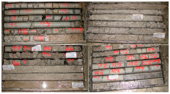 The flexural fracture zones were all deeply buried underground at a depth of approximately 65 m, and the processing depth was between 55 m and 74 m. The whole rock in the upper part of the test area was quite thick (36 m–60 m), and the total underlying flexural fracture zone was also thick (35.1 m) (Figure 2). This area was ideal for a grouting test given the minimal interference from construction. The structure was mainly composed of fragments and debris in the flexural fracture zone, especially fine particles from the debris structure, with a low in situ water content (approximately 4%), high density (2.3 g/cm3), as well as a low-intensity and small osmotic coefficient (10−6 cm/s). This poorly irrigable structure easily collapsed under the influence of water.