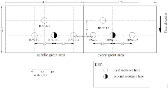 The distance between the composite grouting holes was 1 m. Sequence I holes HCW-I-1 and HCW-I-2 as well as sequence II hole HCW-II-1 of the epoxy test area were arranged in the same row. Sequence I hole HCW-I-3 was arranged in an upstream position, creating a triangle with HCW-I-1 and HCW-II-1 (Figure 3).