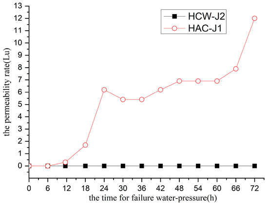 The failure water pressure test started at 1.5 MPa; the pressure was increased 0.1 MPa per hour and stayed at a pressure of 2.0 MPa for 72 h (Figure 4). Under the full pressure of 2.265 MPa, the permeability rate of access hole HCW-J2 in the HCW area was 0 Lu. After 11.6 h of the water pressure test in hole HCW-J2 in the HCW area, the permeability rate was 0.3 Lu. The results of the failure water pressure in the holes in the HCW area showed that the water permeability was basically impervious and remained unchanged with the increase of pressure and time. The water permeability of the inspection holes in the HAC area continuously increased with time. It increased rapidly at 24 h, remained stable from 24 h to 60 h, and increased rapidly again after 60 h. The main reason was that the consolidation bodies formed by the HAC grouting material experienced water swelling; coupled with the inhomogeneity of the soil being poured, the consolidation bodies absorbed water and swelled at 24 h, forming a gel, blocking part of the pores, resulting in an uneven decrease in water permeability. After 42 h, with the increase in pressure, the local gel was slowly destroyed, and the water permeability further increased. The permeability rate was 6.2 Lu at 24 h, 6.9 Lu at 48 h, and 12.0 Lu at 72 h.