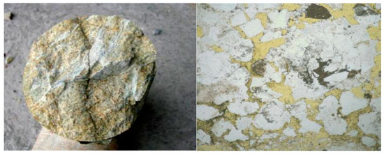 The compound grouting test area was located on a platform upstream of discharge dam 5 to the discharge dam 6, with the dams ranging from 0–87 m to 0–97 m and the right dam ranging from 0 + 78 m to 0 + 91 m, with an elevation of 257 m. The flexural fracture zone underlaid this area. The elevation of the top surface ranged from 214 m to 190 m, the thickness was 19.5–50.7 m, the average thickness was 35.1 m, and it was mainly composed of cataclastic-structured and elastic-structured sandstones. It contained 60.7 percent cataclastic-structured sandstones and 39.3 percent elastic-structured sandstones. The clastic substances in the flexural core of the crushed zone in the test area were shown in Figure 1.