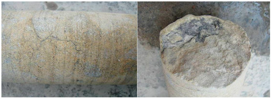 A month after grouting, the drilling of core samples was carried out at three holes in the HCW area, but no whole cores were obtained from the two holes in the HAC zone, and there were no acrylate gel core samples in the hole. Figure 5 was a comparison of the core samples before and after the epoxy resin chemical grouting. Figure 6 was a photograph of core samples one month after the epoxy resin chemical grouting, and, as shown in Figure 6, the picture indicated by the arrow clearly displayed that the epoxy resin slurry leaked in the core sample. There were some grout veins of cement and epoxy in the core sample from the hole with epoxy resin chemical grouting, suggesting that the cement grouting played an important role in the larger porosity of the blocking cracks. The core samples of the microcracks in the flexural fracture zone were fully filled with the epoxy resin slurry. Figure 7 and Figure 8 showed photographs of the core samples six months and one year after the epoxy grouting. Considerable amounts of yellow epoxy resin slurry filled the fractures of the argillaceous section core, with shaly sands and muddy debris cemented into the shape of a column. The silty sand was solid due to the yellow epoxy resin slurry, forming a rock-like material with high strength.