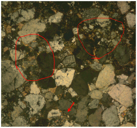 In this study, the parameters of the experimental epoxy zone in the field test were better than those in the acrylate test area. This was mainly due to the use of CW510 epoxy resin grouting material and HAC grouting material in the indoor curing test of the clastic rock in the test area, and the compressive and tensile strength of the HAC mold specimens was weaker than that of the HCW mold specimens (Table 1). The video results of the inspected holes after epoxy grouting are shown in Figure 9. The epoxy resin entered the fine voids, fissures, clayey soil, shaly sand, as well as the silty sand and bonded these formations together, significantly improving the overall mechanical properties in the treated zone. In addition, the polarized light micrographs of the inspected holes after epoxy grouting also showed a clear yellow grouting material (Figure 10). Moreover, it can be clearly seen from the red circle and arrow pointing in Figure 10 that the epoxy resin slurry played a bonding role in the broken core sample.