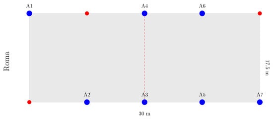 The monitored points during the experimental dynamic measurements are depicted in Figure 4. The monitoring system includes seven triaxial MEMS accelerometers (A1 to A7), characterized by a sampling frequency of 250 Hz.