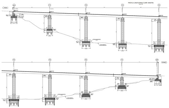 Bridge B comprises two identical adjacent and connected structures, each featuring an eight-span composite steel–concrete girder deck, for a total of 302 m in length (Figure 6). The outer spans measure 37 m each, while the inner spans are 38 m long. The deck of each of the two structures (Figure 7) consists of two main continuous I-shaped steel beams connected by a series of I-shaped steel cross girders and a 35 cm thick concrete slab, bordered by reinforced concrete curbs. The central curb is used as a connection between the two adjacent decks. The substructure includes seven piers with a composite steel–concrete section and prismatic reinforced concrete abutments.