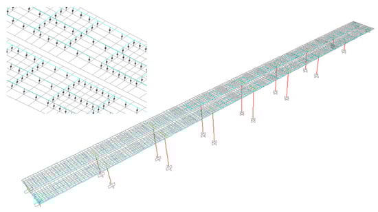 The bridge model is developed in SAP2000 [], using frame FEs for all structural members, i.e., the main beams of the deck, including the slab, the cross beams, the curbs, and the piers (Figure 3). The connection between the longitudinal and the transverse cross beams of the deck is ensured by the definition of FE mesh, which divides the longitudinal beams at the intersections with the cross beams. A similar approach is used to connect the FEs representing the other structural members to the structure. The deck is connected to the piers and abutments using a two-node link system: a set of fully rigid links connects the mesh nodes at the pier cap to the mesh nodes at the intrados of each bearing, and another set of rigid links, representing the bearings, connects these nodes to those at the intrados of the main longitudinal beams. These latter restrict only specific translational degrees of freedom of the connected nodes, according to the bearing features. Pier bottoms are fully restrained. The impact of the soil layers is not considered because the mechanical properties of the soil show that it can be modeled as a simple fully restraint. Since the spans are simply supported, and the coupling given by the piers and other secondary elements was evanescent during the experimental investigations, the FE model includes only span #4 of one carriageway, which is the span where sensors have been placed during the dynamic measurements. Finally, all the dead loads, such as bridge deck pavement, are taken into account as additional equivalent distributed line load applied to the frame FEs representing the deck.