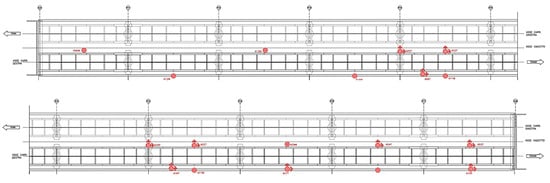 The monitored points during the experimental measurements are shown in Figure 9. The monitoring system includes mono- and tri-axial MEMS accelerometers, placed on the spans of the bridge according to the two experimental setups of the figure.