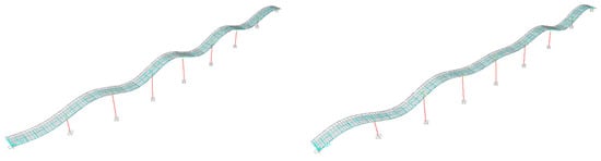 It is noteworthy that functions MAC1, MAC2, MFM1, and MFM3, which account for mode shape variation, display a higher total error value for the +10% simulation compared to the rest of the curve. This is due to a coupling in the mode shapes that occurs at a parameter value of 1.1 E0 (+10%). Figure 14 illustrates the deformed shape of one of the vibration modes obtained for (a) E0 (0% variation) and (b) 1.10 E0 (+10% variation). As observed, whereas in the initial model (Figure 14a), this mode shape involves only the flexural vibration of the deck, for 1.10 E0 (Figure 14b) this vibration is coupled with that of one pier. This change in mode shape topology is accurately captured by objective functions MAC1, MAC2, MFM1, and MFM3 but, as expected, is not detected by function f. Function MFM2 also fails to describe this effect, as it is based on the difference in the norm of the modal flexibility matrix (Equation (11)), and thus only captures overall variations in structural behavior.