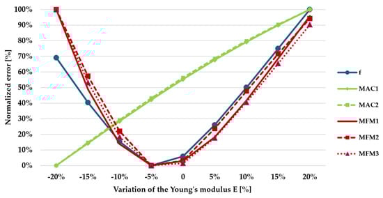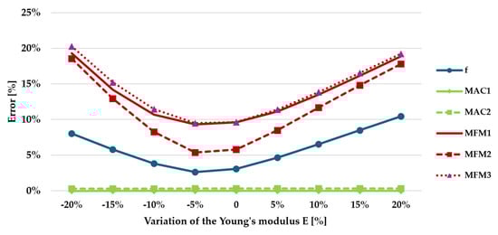 Functions f and MFM2 exhibit a smooth trend, with a minimum value between +5% and +15% of E0. Function MAC1 appears almost insensitive to the parameter variation, similar to the behavior observed in Bridge A. Consequently, MAC1 is excluded from subsequent analyses. Lastly, functions MAC2, MFM1, and MFM3 display a minimum value around −5% of E0. However, for this bridge, MFM1 and MFM3 indicate a higher overall error level due to the coupling error in frequencies and mode shapes.