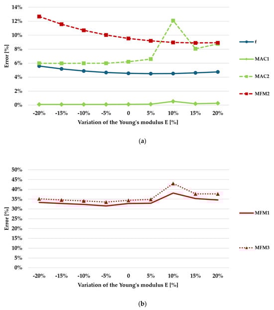 Percentage errors for the different objective functions adopted in the sensitivity analysis of Bridge B, for Case 2 (i.e., with weighting coefficients proportional to the modes order): (a) objective functions f, MAC1, MAC2, and MFM2; (b) objective functions MFM1 and MFM3.