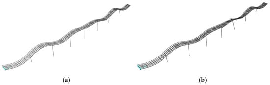 Deformed shape for the 14th vibration mode of Bridge B obtained for a value of the parameter equal to (a) E0 (0% variation) and (b) 1.10 E0 (+10% variation).