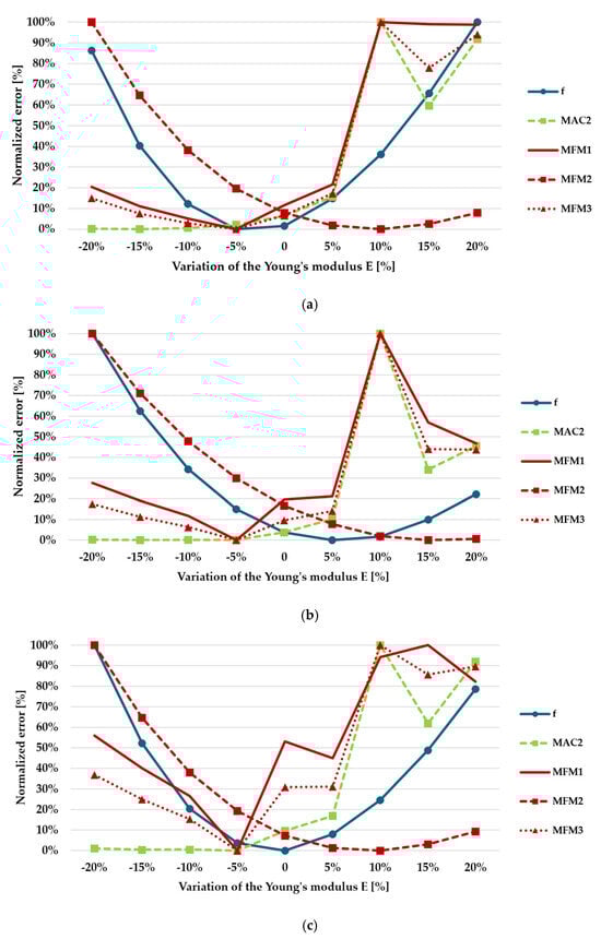 - As already observed for Figure 13, functions MAC1, MAC2, MFM1, and MFM3 capture the coupling in the mode shapes that occurs at a parameter value of 1.1 E0 (+10%), which results in a peak of the normalized objective function.