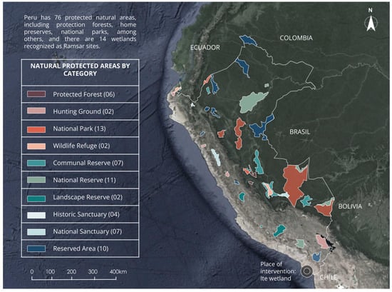 Peru has 76 protected natural areas, including protection forests, hunting reserves, national parks, and others [3] (Figure 1). There are 14 wetlands recognized as Ramsar sites, designated for ecosystems categorized as Wetlands of International Importance, across the country, ten of which are located in nine of the protected natural areas [4]. Protected natural areas in Peru are crucial for the conservation of biodiversity and the maintenance of essential ecosystem services, such as climate regulation and the water cycle [5,6]. They host a rich variety of flora and fauna, many of which are endemic and endangered, and are fundamental for scientific research and the development of medicines [7]. Additionally, these areas play a vital role in the preservation of indigenous cultures, providing resources and sacred spaces. Their conservation also promotes ecotourism, generating income and fostering environmental education among locals and visitors [8,9].