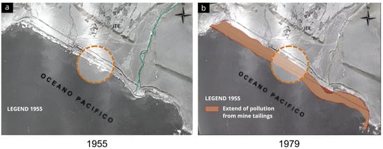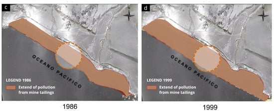 The degradation of the natural ecosystem of the wetland in Ite Bay began in 1955 (Figure 2) because of the deposition of mining tailings, which introduced heavy metals and other toxic pollutants into the environment. These wastes, resulting from mining activities, progressively accumulated, affecting the quality of water and soil, as well as local biodiversity. In 1956, the development work for the Toquepala mine in Tacna, Peru, began. Subsequently, the Toquepala and Cuajone mines started operations in 1960 and 1976. Southern’s main metallic products were copper, molybdenum, and silver. As a consequence of these operations, the river waters became a means to transport the tailings to the fields and then discharge them into the Pacific Ocean through the Locumba River and Ite Bay, generating heavy metal contamination. Between 1979 and 1986, the extent of the degradation significantly increased, as shown in Figure 2b, spreading along the bay and exacerbating the negative impacts on the wetland ecosystem. Between 1960 and 1976, activities in Ite Bay caused severe wetland contamination due to the deposition of mining tailings. This process significantly deteriorated the marine coastline, altering it to encompass more than 1600 hectares, with a width of 1.5 km and a length of 12 km. In 1996, mining tailings deposits were suspended by Supreme Decree No. 02089, but this action could not reverse the consequences of the contamination, which led to the growth of the wetland.