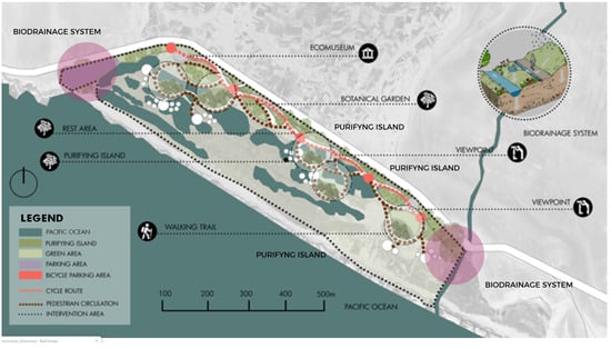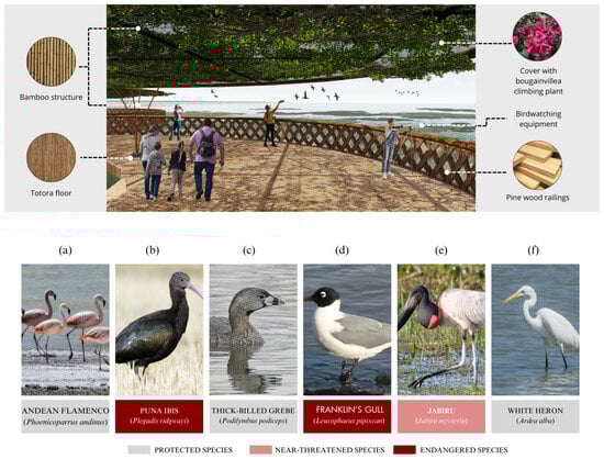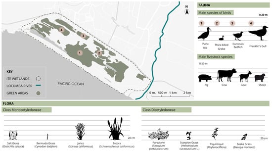As a result of industrial activities in the mining sector, critical areas for aquatic and migratory birds, many of which are considered rare, have been compromised. Birds are now exposed to significant threats due to the alteration of the ecological balance caused by this destruction. The intervention site has highly degraded areas, making it important to implement green infrastructure. This infrastructure will include a linear park composed of public spaces, viewpoints, and recreational areas that will allow for the revaluation of the Ite wetlands [18]. The main objective of the green infrastructure is to create an integrated scheme that seeks to establish spatial, landscape, and ecological continuity, connecting the environmental elements of the territory with significant environmental, cultural, agricultural, and landscape value, as well as areas at risk [19,20].