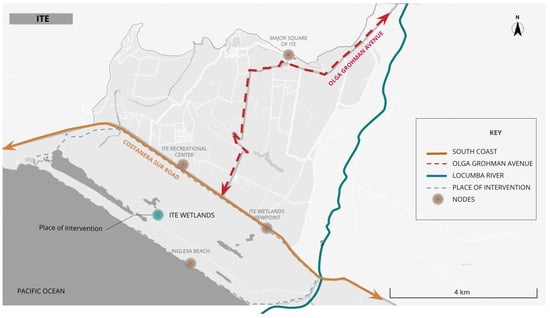The Ite wetlands are located between kilometers 60 and 72 of the Carretera Costanera Sur, 90 km from the city of Tacna, and 0.5 km from Avenida Olga Grohmann de Basadre, which runs through the entire district of Ite and connects it by road to the city of Tacna (Figure 9).