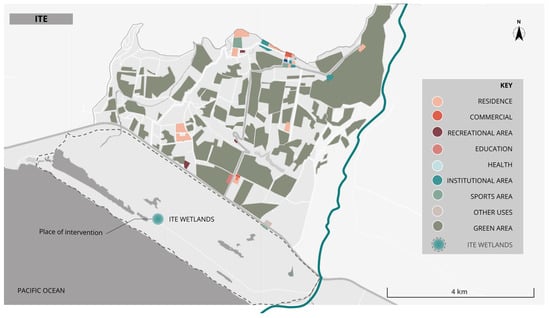The Ite wetlands, also known as the Ite Lagoons, cover an area of 1680 hectares and are located in the Ite district, within the Jorge Basadre province of the Tacna department, Peru. They are situated 90 km northwest of the city of Tacna (17°53′17″ S, 70°59′17″ W; sea level). These wetlands have been recognized as an Important Bird Area and are the second largest in South America, standing out as one of the main tourist destinations in the Tacna region (Figure 6). The project is located in the Ite wetland because of its high ecological importance, which harbors unique biodiversity, although it faces threats such as pollution from mining activities and environmental degradation. The placement of the green infrastructure, in this case, a linear park, was strategic, as the wetland’s vegetation allows it to integrate with green infrastructure, promoting community connection with nature and fostering environmental awareness. Additionally, wetlands provide an ideal environment for recreational and educational activities focused on conservation and ecotourism. However, this is not currently happening in the surroundings of the Ite wetlands because of their degradation [27].