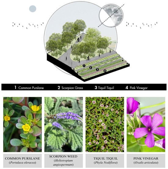 Additionally, educational elements will be integrated into the garden design to promote environmental awareness and appreciation of biodiversity. Informational panels will highlight the features and benefits of native plants, emphasizing their crucial role in ecological balance and the preservation of local flora and fauna. This information will help raise awareness among visitors, inspiring them to actively participate in the conservation of natural habitats and adopt sustainable practices in their own communities. In this way, the gardens will serve not only as spaces of beauty and tranquility but as powerful tools for environmental education and the promotion of biodiversity conservation. The botanical garden will have different species distributed inside. The plant species that will be implemented in the botanical garden located on the platforms are the common verdolaga (Portulaca oleracea), scorpion grass (Heliotropium angiospermun), and pink vinegar (Oxalis articulata), which are medicinal plants, and tiquil tiquil (Phyla Nodiflora), which is an ornamental plant.