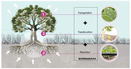 The biodrainage system involves a combined process of absorption, translocation, and transpiration of excess groundwater. For the system to be efficient, trees must grow quickly and have a high transpiration capacity to absorb a sufficient amount of water from the capillary fringe above the water table. The absorbed water is transported to different parts of the plants, and finally, more than 98% of the absorbed water transpires to the atmosphere, mainly through the stomata [45] (Figure 19).