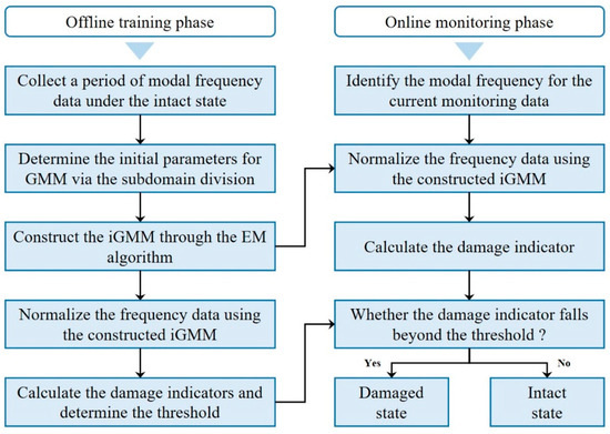 This iGMM-based damage detection approach consists of two key phases: offline training and online monitoring. In the offline training phase, a period (e.g., one year) of modal frequency data under the intact state of the monitored structure is collected for iGMM construction, data normalization, damage indicator calculation and damage threshold determination. In the online monitoring phase, the currently identified modal frequency data is first normalized for calculating a damage indicator which is then used to compare with the damage threshold to assess if the monitored structure is damaged. The specific flowchart is shown in Figure 1.
