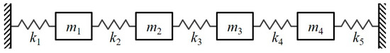 A four-degree-of-freedom (DOF) mass-spring system, illustrated in Figure 2, is analyzed to validate the effectiveness of the proposed iGMM-based damage detection method. In this system, both ends are fixed to the ground, and each lumped mass has a weight of 2 kg. The nonlinear influence of environmental changes is simulated by defining the functional dependence of stiffness on temperature as shown below [38,51]: