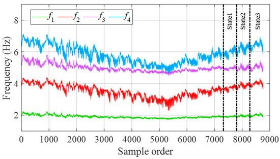 A total of 8760 h continuous air temperature monitoring records [51,52], as shown in Figure 3, were used for the numerical simulation of modal frequencies. To simulate damage, the stiffness of the second spring was reduced. Three scenarios were considered: for damage state 1, a 10% reduction occurred over data points 7321 and 7800, for damage state 2, a 20% reduction was applied over data points 7801 and 8280, and for damage state 3, a 30% reduction was introduced over data points 8281 and 8760. For each temperature, the equations of motion were solved to obtain the four modal frequencies of the mass-spring system. To account for measurement errors, a small amount of Gaussian white noise () was incorporated into the modal frequency data. The four time series of simulated modal frequencies are illustrated in Figure 4, where the dashed vertical lines mark the onset of the three damage states. As shown in the figure, temperature variations result in pronounced nonstationary fluctuations in modal frequencies. Because these temperature-induced fluctuations are greater in magnitude than those from stiffness loss, the simulated damages in the mass-spring system cannot be detected by observing modal frequency changes alone.