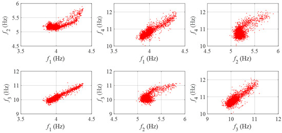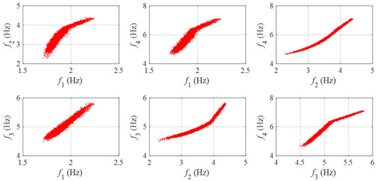 In order to further understand the simulated modal frequencies, the scatter diagrams representing the mutual correlations between modal frequencies (in the intact state of the mass-spring system) are presented in Figure 5. The figure clearly shows that, except for the correlation between the first and third modal frequencies, the relationships between modal frequencies are nonlinear due to the nonlinear behavior of the third spring. Additionally, the degree of nonlinearity varies among different modal frequency pairs.