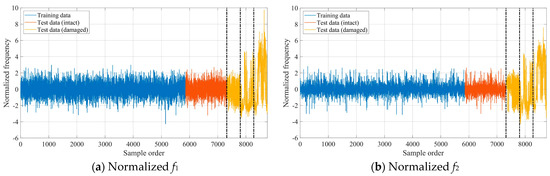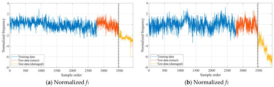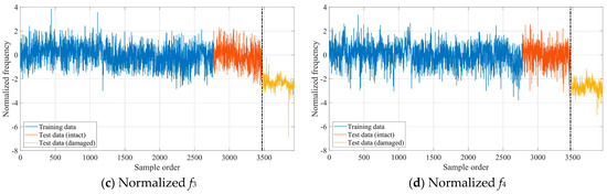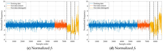 Similar to the numerical case study, the GLRT-based subdomain division strategy was employed to determine the initial parameter values of GMM. Each training data vector’s 2-norm was calculated, and the training dataset was reordered in ascending order accordingly. In this real-world case, the iGMM achieved optimal construction when the sliding window size was 11% of the total training dataset. The iGMM was subsequently used to normalize both training and test datasets. Figure 12 illustrates the four normalized modal frequencies, with the dashed vertical line indicating the damage onset. Compared with Figure 10, it can be clearly seen from Figure 12 that the normalized modal frequency data in the intact state becomes stationary, and there is an obvious difference between the normalized modal frequencies in the damaged state and the normalized modal frequencies in the intact state. These results demonstrate that the iGMM-based data normalization process is capable of removing the environmental effects on structural damage detection. Moreover, the scatter diagrams representing the mutual correlations between the normalized modal frequencies in the intact state are shown in Figure 13. Compared with Figure 11, it can be clearly seen from Figure 13 that the mutual correlations between the normalized modal frequencies become more linear.