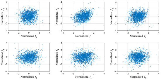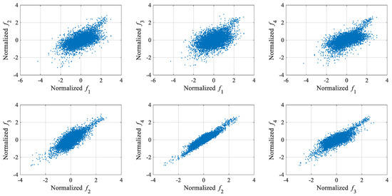 The GLRT-based subdomain division strategy was employed to determine the initial parameter values of GMM. Each training data vector’s 2-norm was calculated, and the dataset was subsequently arranged in ascending order according to these computed norms. In this numerical example, the optimal construction of the iGMM was achieved with a sliding window size equal to 14% of the total training sample count. The iGMM was then applied to normalize both the training and test datasets. Figure 6 displays the four normalized modal frequencies from these datasets, with the three dashed vertical lines marking the starting points of the respective damage states. Compared with Figure 4, it can be clearly seen from Figure 6 that the normalized modal frequency data in the intact state becomes very stationary, and there is an obvious difference between the normalized modal frequencies in the damaged state and the normalized modal frequencies in the intact state. These results demonstrate that the iGMM-based data normalization process is capable of removing the environmental effects on structural damage detection. Moreover, the scatter diagrams representing the mutual correlations between the normalized modal frequencies in the intact state are shown in Figure 7. Compared with Figure 5, it can be clearly seen from Figure 7 that the mutual correlations between the normalized modal frequencies become more linear.