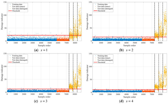 The cumulative T2 statistics were calculated for the normalized modal frequencies in both the training and test datasets to demonstrate the damage detection performance of the proposed method. The damage detection results using the cumulative T2 statistics with , , and are, respectively, shown in Figure 8. It can be clearly seen that rare damage indicators fall beyond their corresponding thresholds when the mass-spring system is in an intact state, there is a tendency for the damage indicators to increase as the damage level increases, and more and more damaged samples are successfully detected as the number of consecutive samples used to calculate the cumulative statistics increases. The damage detection rates corresponding to Figure 8 are calculated and listed in Table 1. It is seen that the false alarm rates are very low for all the damage indicators when the mass-spring system is in the intact state, and the damage indicator with is capable of detecting the three levels of damage when the mass-spring system is in the damaged state.